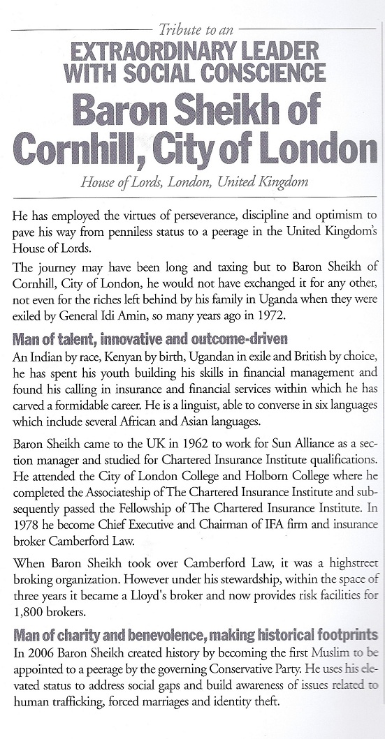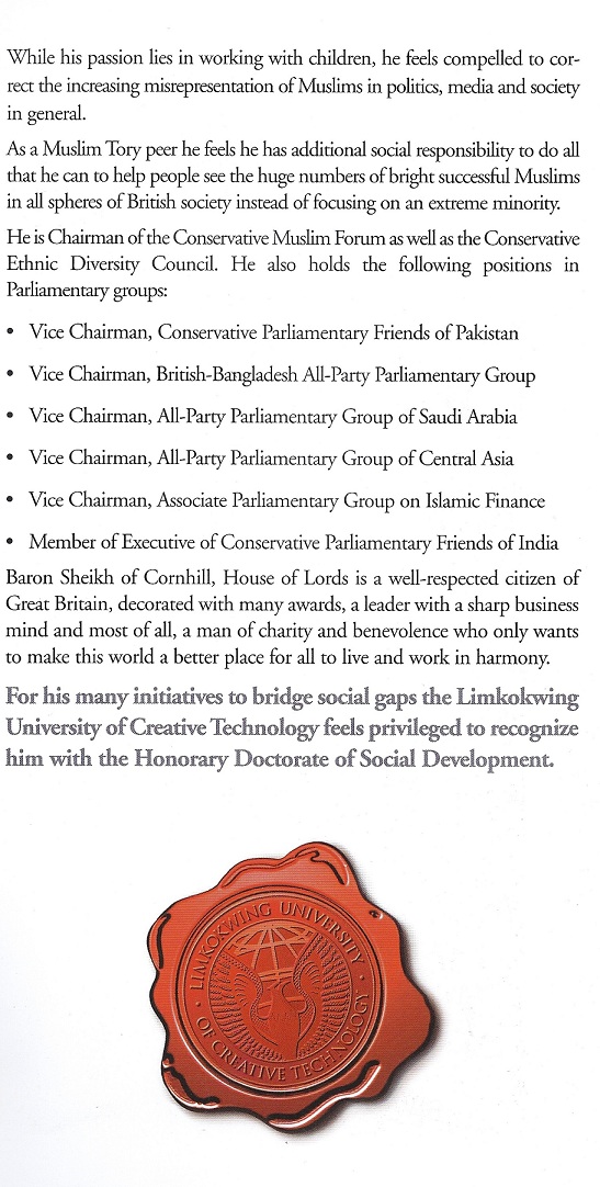 Lord Sheikh was awarded an honorary doctorate by the Limkokwing University of Creative Technology and travelled together with Lady Sheikh to receive the doctorate at the graduation ceremony in Kuala Lumpur. At the ceremony Lord Sheikh addressed the audience of over three thousand people.